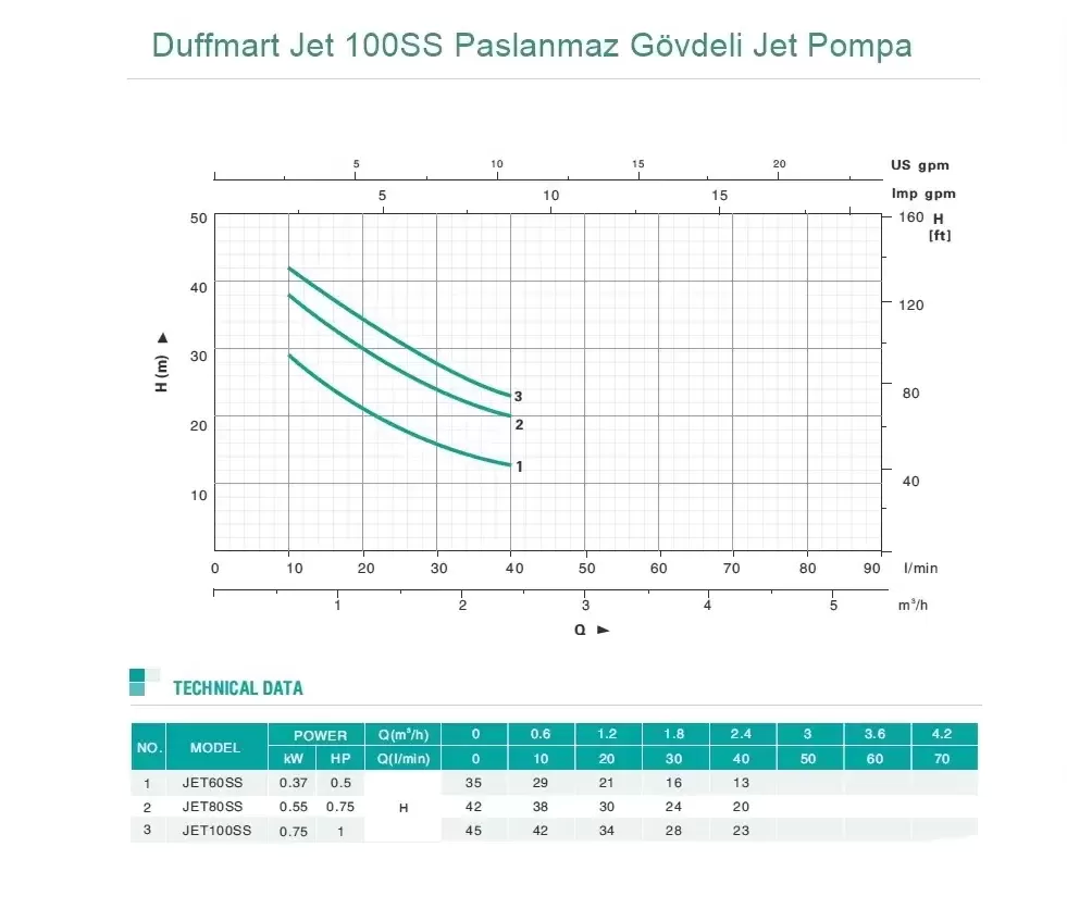 Duffmart Jet 100SS Paslanmaz Gövdeli Jet Pompa temiz ve kimyasal olmayan sıvıların kullanımı için uygundur. Duffmart Jet 100SS Paslanmaz Gövdeli Jet Pompa hava kabarcıklarının olduğu durumlarda bile en iyi performansı sağlamak için dizayn edilmiştir.Küçük ve orta büyüklükteki su gereksinimlerini karşılamak,evlerde,bahçelerde ve imalathanelerde kullanım için tasarlanmıştır.Gerekli kompanetler (basınç şalteri,genleşme deposu ve flex hortum) ile hidrofor olarak kullanımı mümkündür.